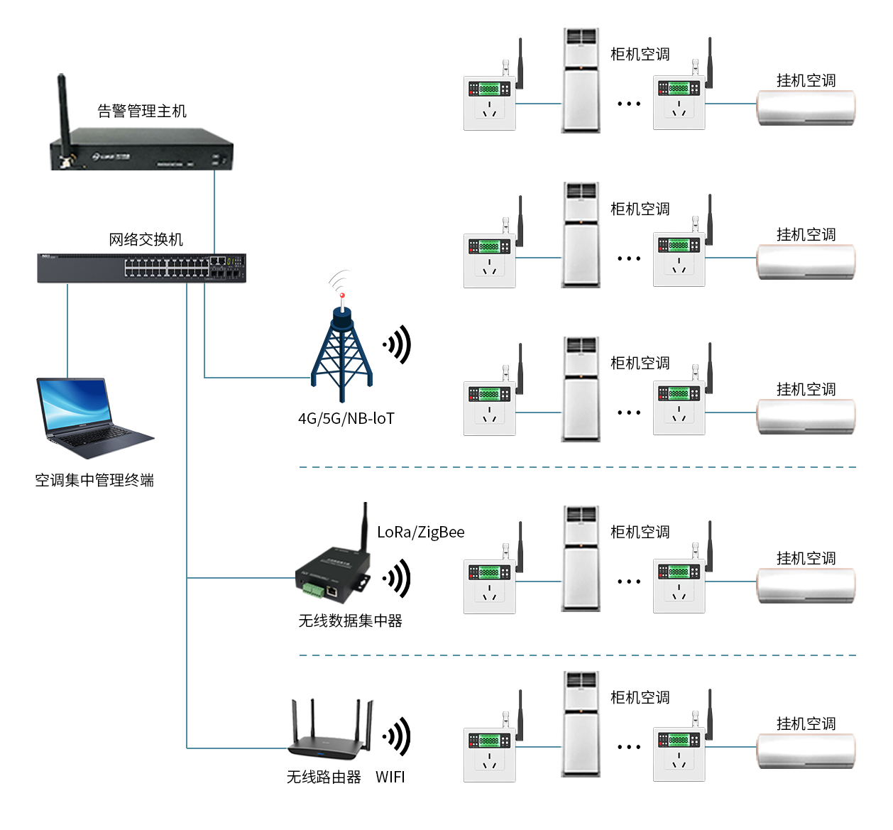 ACsmart-WL系列無線空調控制器,可選配不同類型的通訊模塊,支持包括:WiFi、LoRa、ZigBee、NB-IoT、4G/5G等無線通信方式,空調控制器聯網成功后,空調集中管理中心即可實時監測所有空調的開啟狀態、運行參數以及用電詳情等信息,同時支持遠程控制所有在網空調,支持"一鍵"操作批量空調,譬如:一鍵開/關機、設定統一運行溫度、系統自動調度聯動指定空調等功能。